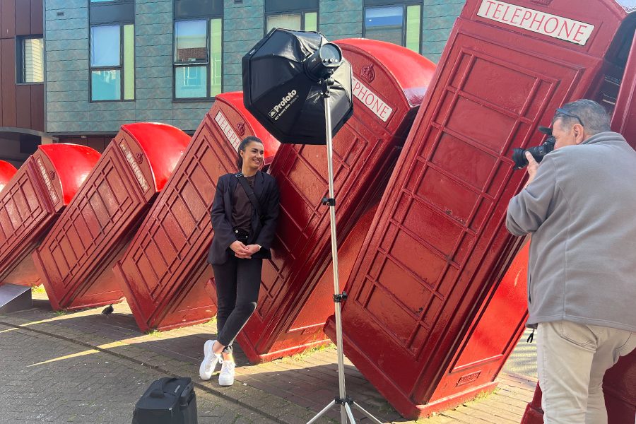 Technically due to the intense midday sun it was a tricky image to take. The answer was to put Zecira on the shadow side of the telephone boxes and to light her up with flash from an off camera Profoto B10.